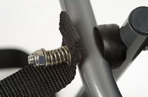 When in use the kayak / craft sits on the angled cradle section at the top of the trolley and can be quickly secured in place using the cam buckle tie down stap – when done you simply fold the trolley flat and remove the two ring pins which hold the wheels for storage.